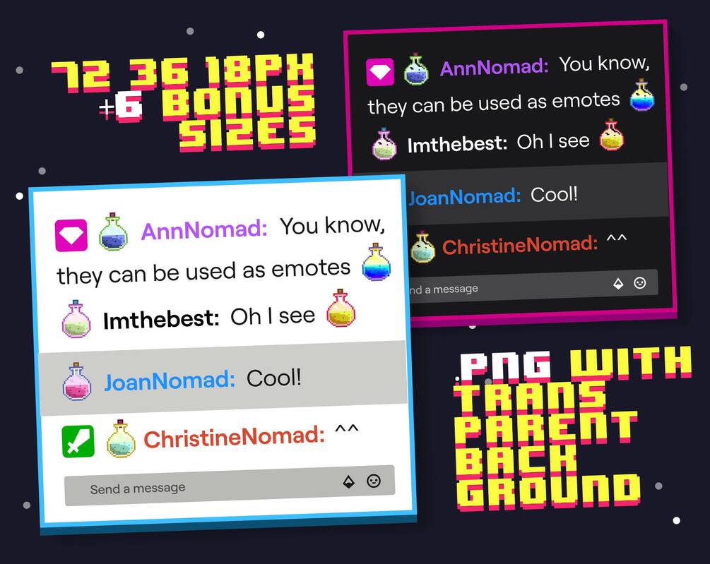 Perfect for any streamer. Use on youtube, twitch, discord and more! Twitch emote files are provided at the correct dimensions and will look equally great on both the dark and light theme of Twitch.tv.