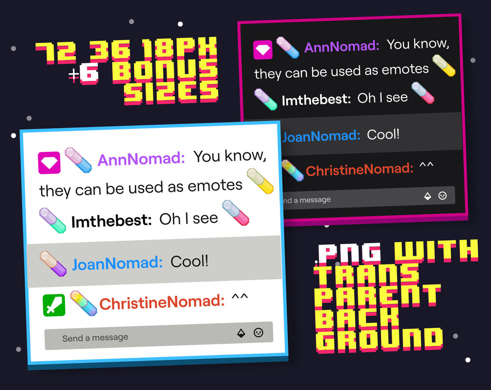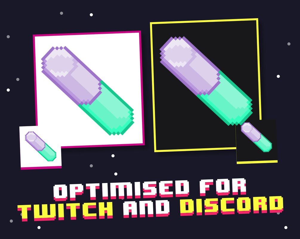 Perfect for any streamer. Use on youtube, twitch, discord and more! Twitch emote files are provided at the correct dimensions and will look equally great on both the dark and light theme of Twitch.tv.